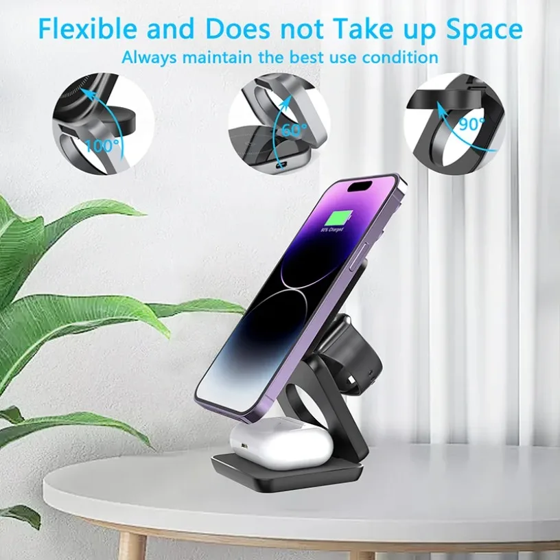 ?Carregador sem fio 3 em 1?:A estação de carregamento sem fio 3 em 1 para carregador Apple MacSafe para vários dispositivos é uma ótima opção para organizar sua casa, escritório ou sala de reuniões.Ele permite que você diga adeus aos cabos emaranhados e bagunçados, mantendo seu espaço limpo e organizado, tornando-o uma solução de carregamento conveniente para seu estilo de vida agitado.